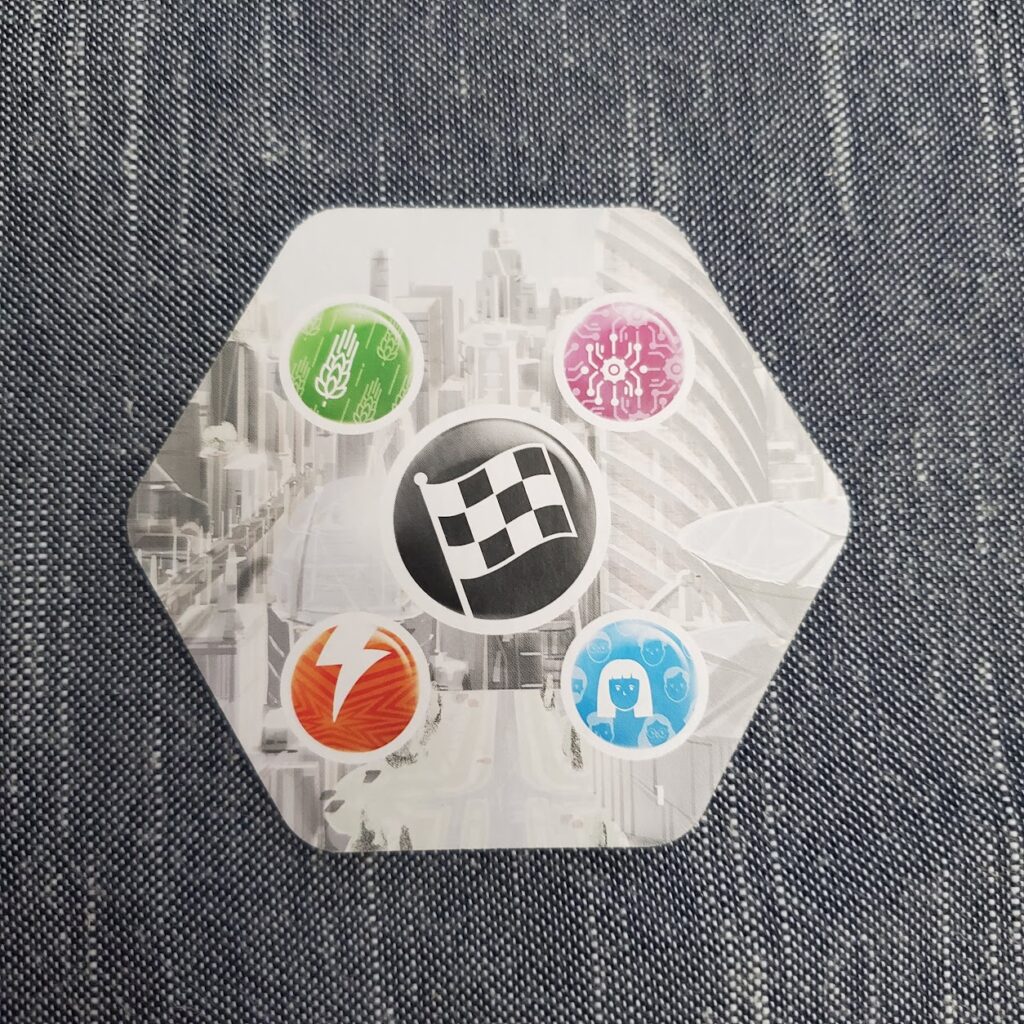 Set in the near future, in the year 2055, a group of entrepreneurs work to create an advanced city able to sustain itself and keep the balance harmonious between the three regions. Players use four elements produced in different factories to complete projects. Balance between the regions is the key in placement to optimize points to win the game.