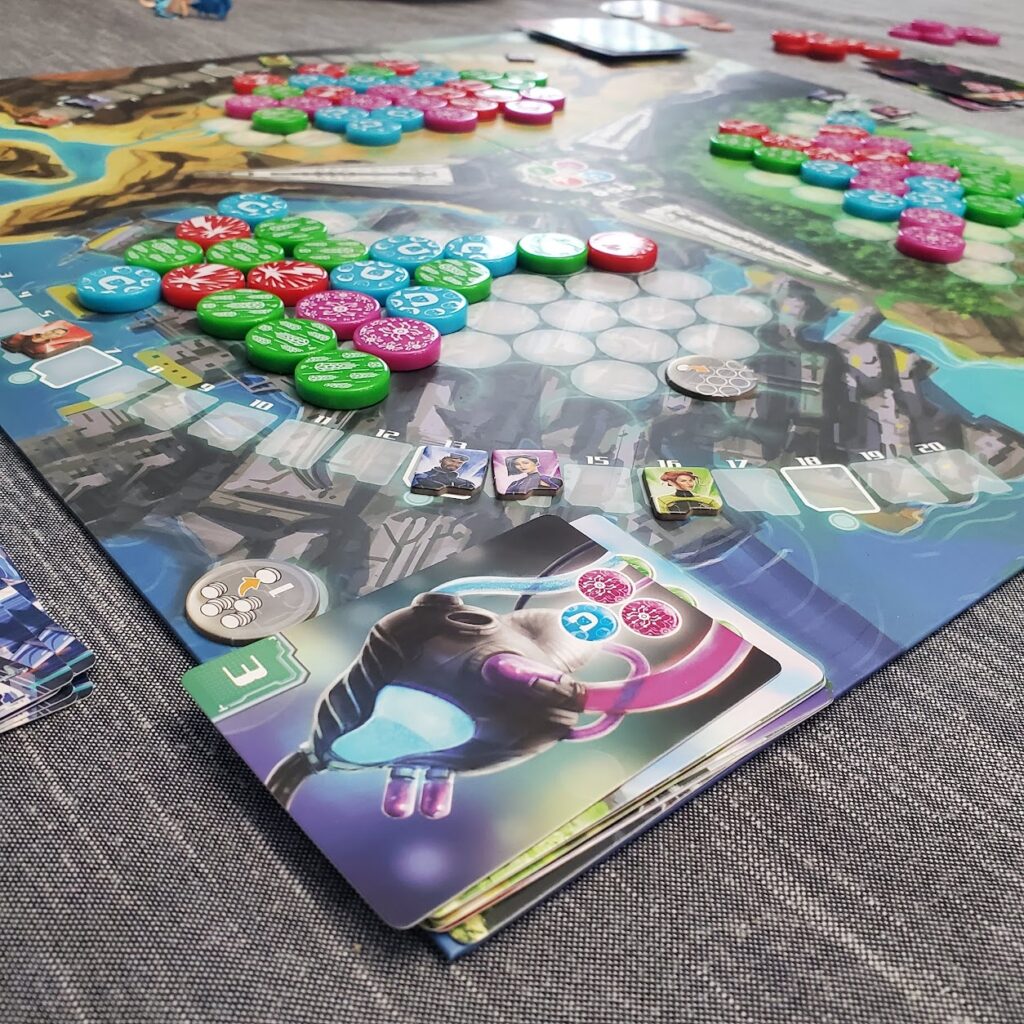Players score three ways in Neotopia. First, when a player fulfills one of their project cards, they immediately gain the points on the card on the score tracker for the region where the project was completed.
