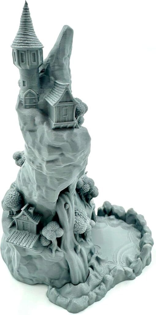 This cottage core dice tower adds a whimsical forest village to your TTRPG fun. Cottages, trees and waterfalls set the scene for the dice tray below. Perfect for any standard dice set. Ready to go or paintable for the player looking for a customization project.