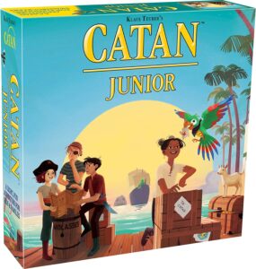 A popular game which has been simplified for younger gamers is Catan Junior. This is a route building resource management game for ages 6 and up and is for two to four players. Like the original Settlers of Catan you are collecting resources based on the numbers that come up with each roll. These resources used to build or get Coco the Parrot cards which provide resources or the ability to build at no cost. Instead of building settlements, cities, and roads in the full version you are building pirate ships and hideouts. The first player to build seven pirate hideouts wins.