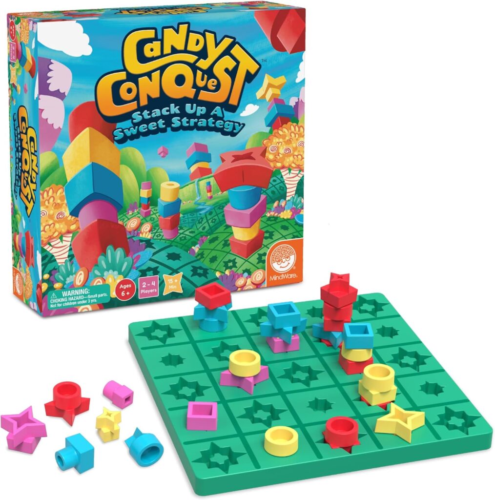 Making sets and getting four in a row is a classic mechanism that works well for young children. Candy Conquest adds a three dimensional aspect to the set making. Players can stack their pieces on top of other ones regardless if the bottom piece is theirs or an opponents. Since squares are never taken and closed off, it opens up significantly more strategy and options.